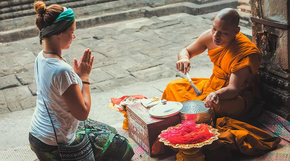 A highlight of the visit to Angkor Wat is that you will be blessed by a Monk in Angkor Wat. Monks will do so by splashing holy water and tying a red string around the person's wrist, representing protection and strength.