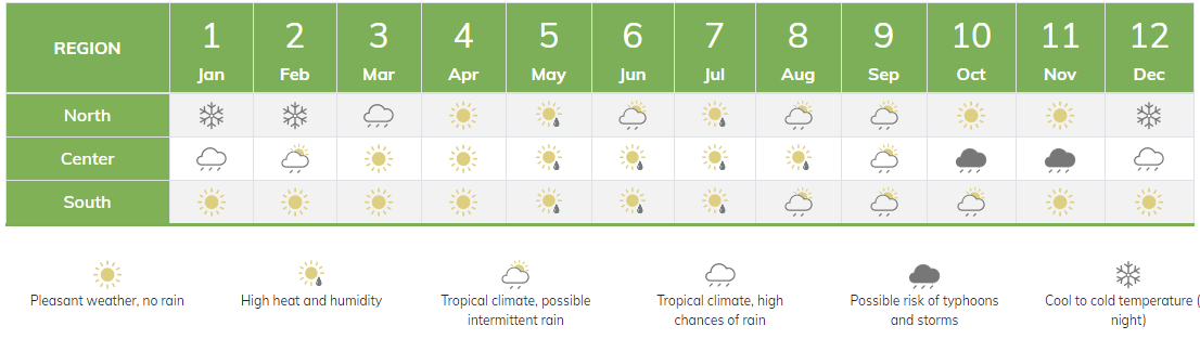 From March to December, skies are more likely to be clear. Summer months of June, July and August are rainier and hotter. Winter (January to February) is a period of time that contains a risk of cold, foggy, and rainy weather.